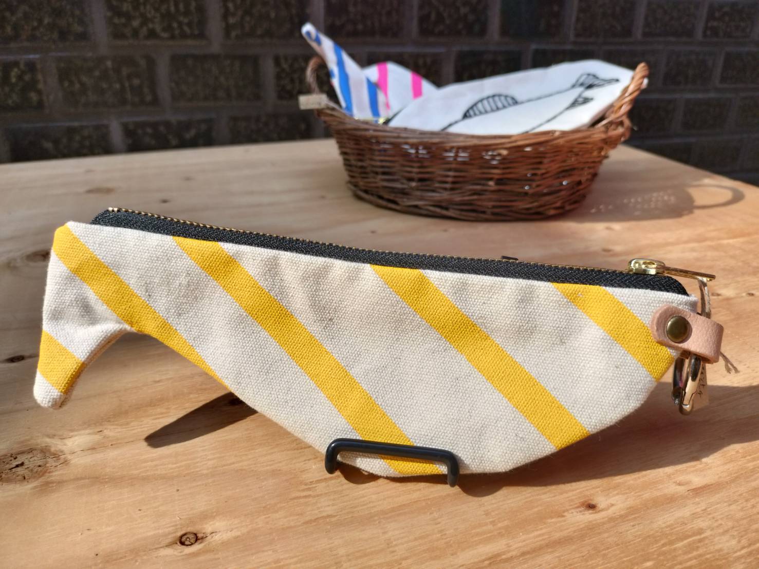 ※写真1、2枚目奥に他のポーチが写っておりますが、当商品は黄ストライプ柄1点です。