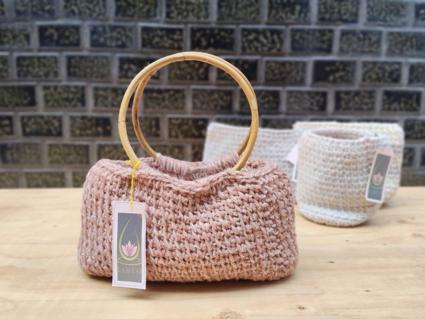 バンブーハンドル付きのピンクの編み物バッグが入荷いたしました♪