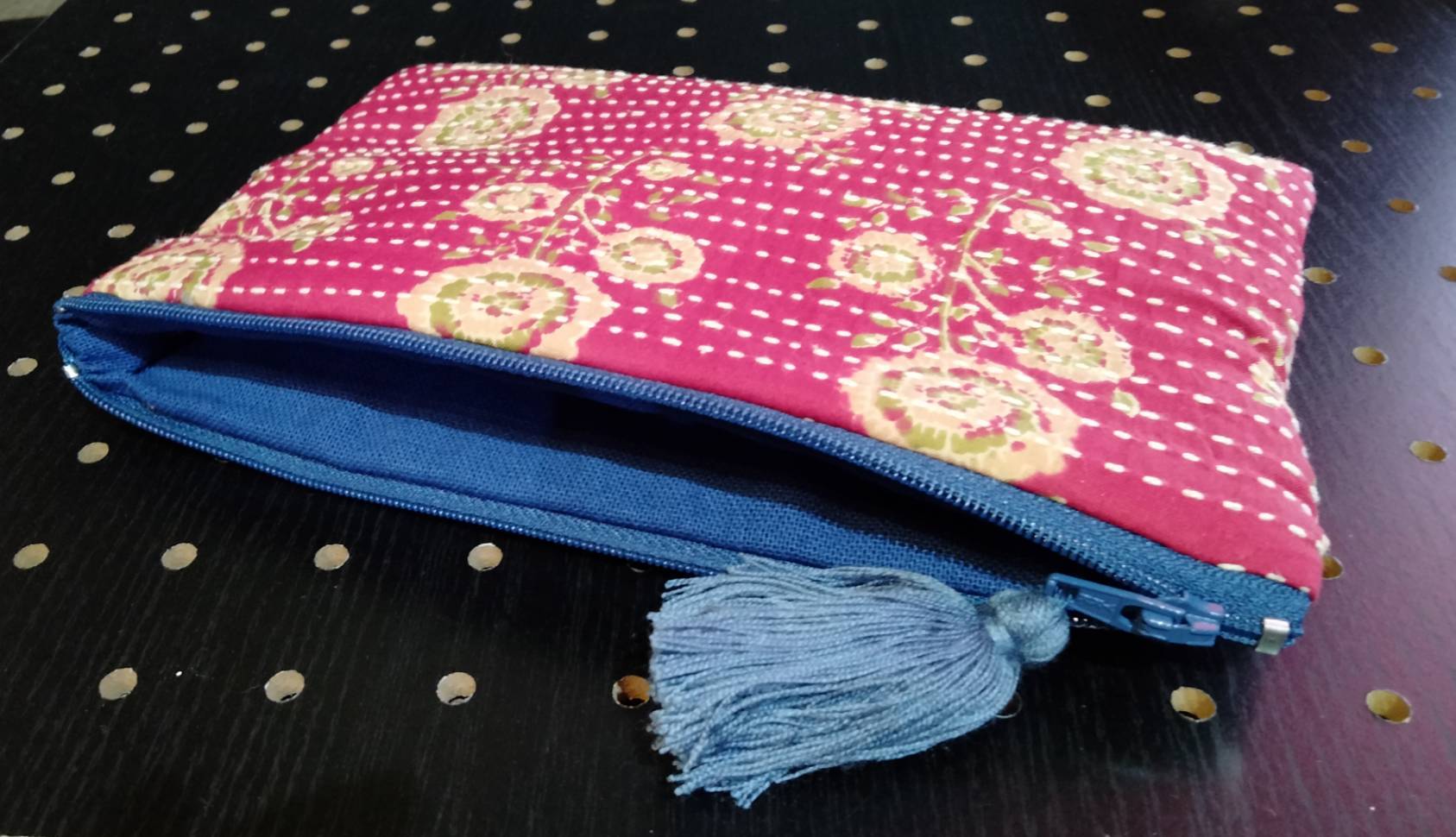ひと針ひと針丁寧に縫いあげられたポーチ