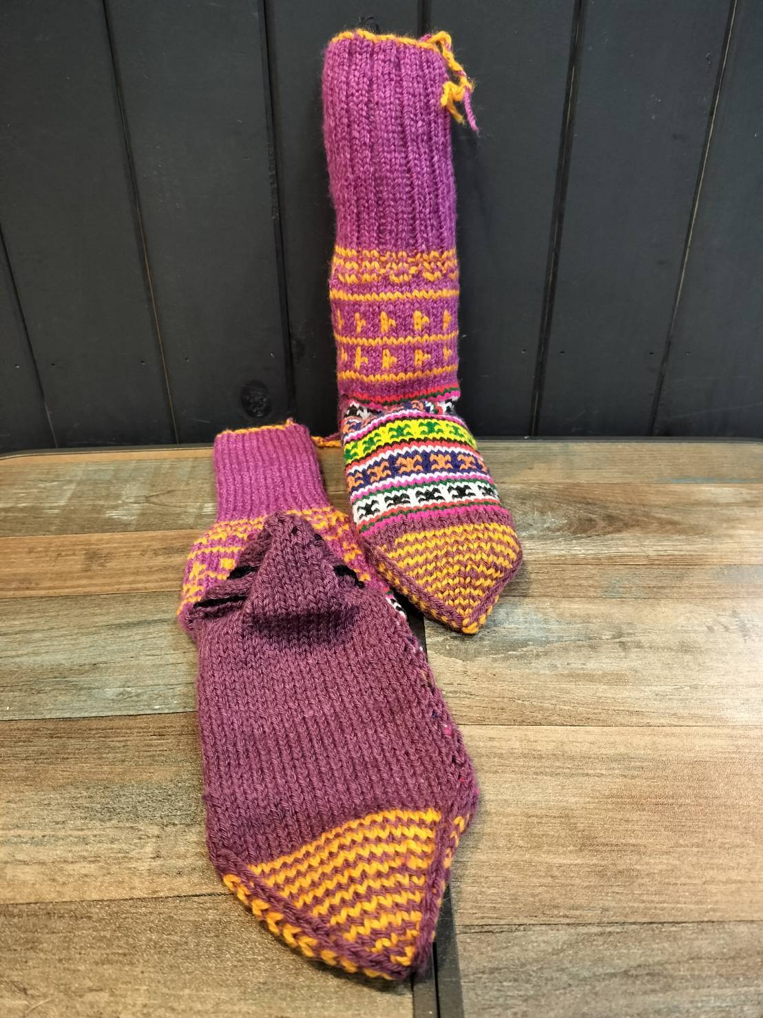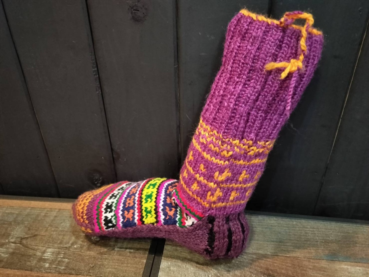 手編みでつくった靴下は、カラフルでとってもあたたかみがあります。