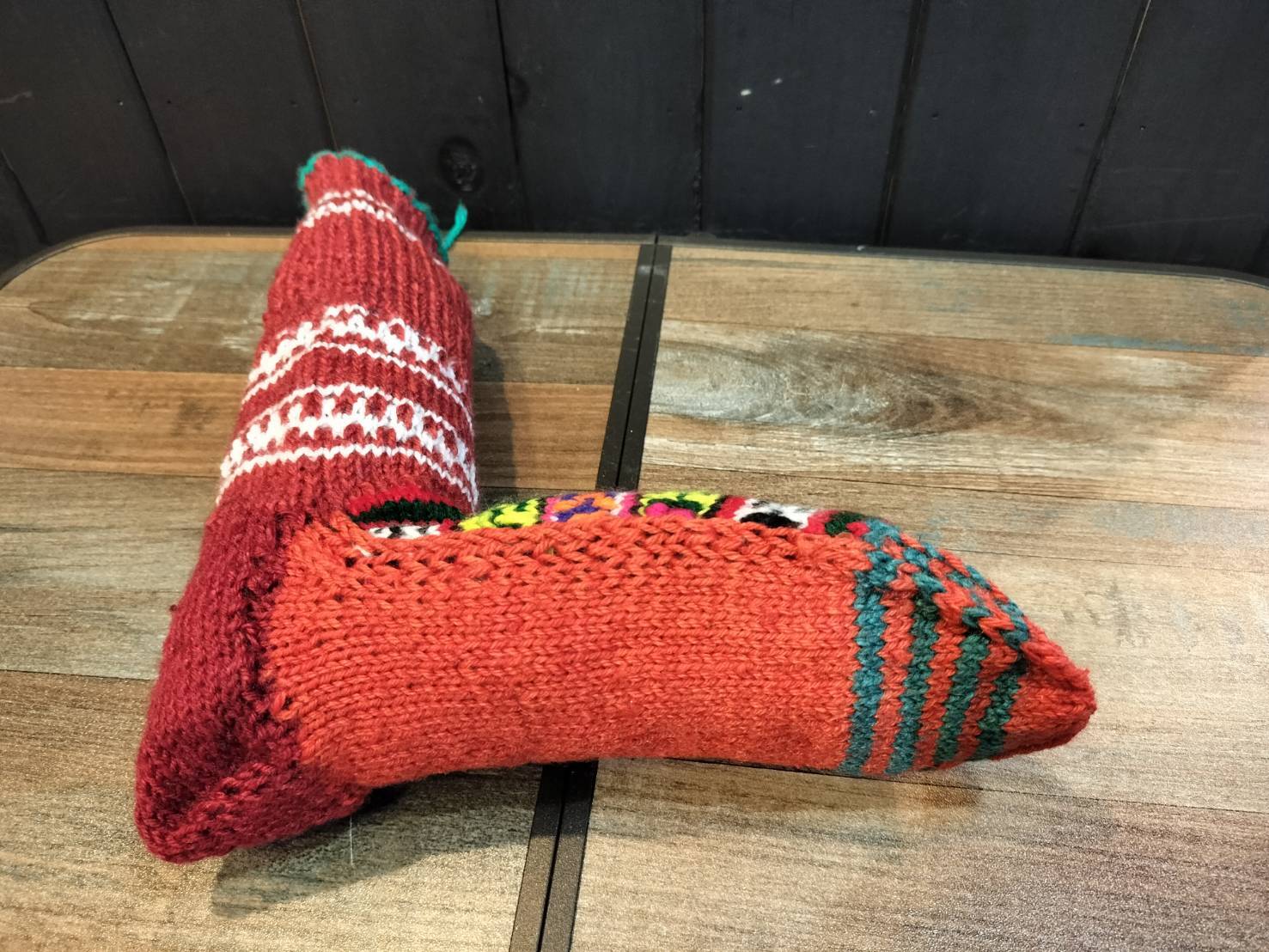 手編みでつくった靴下は、カラフルでとってもあたたかみがあります。