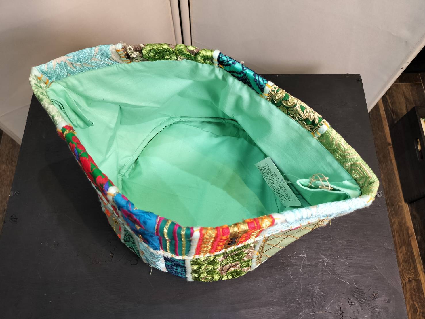 サリーやクルタなど華やかな刺繍やビーズが施された伝統衣装の希少なビンテージ布をひとつひとつ手で繋ぎ合わせて生地です。