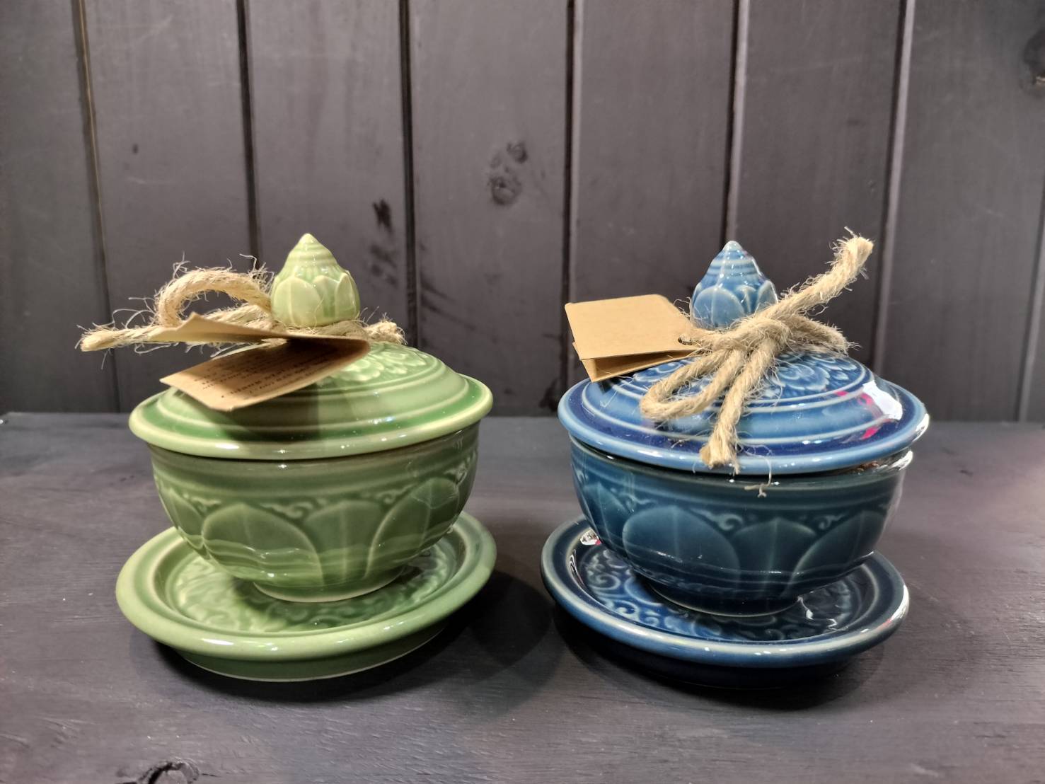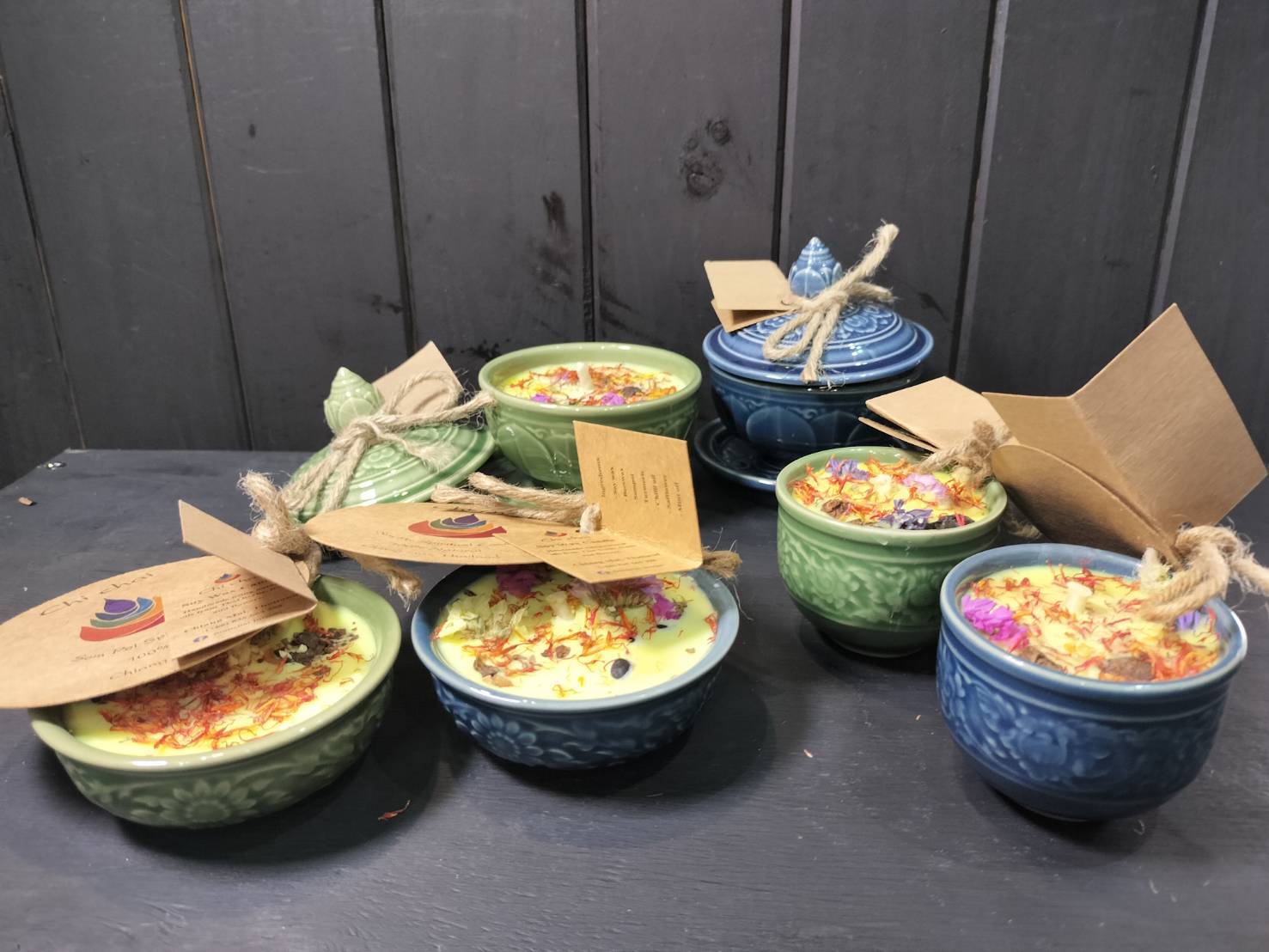 ※写真には複数のキャンドルが写っておりますが、こちらの商品は写真1枚目右側の皿・蓋付の【青色】の商品になります。
