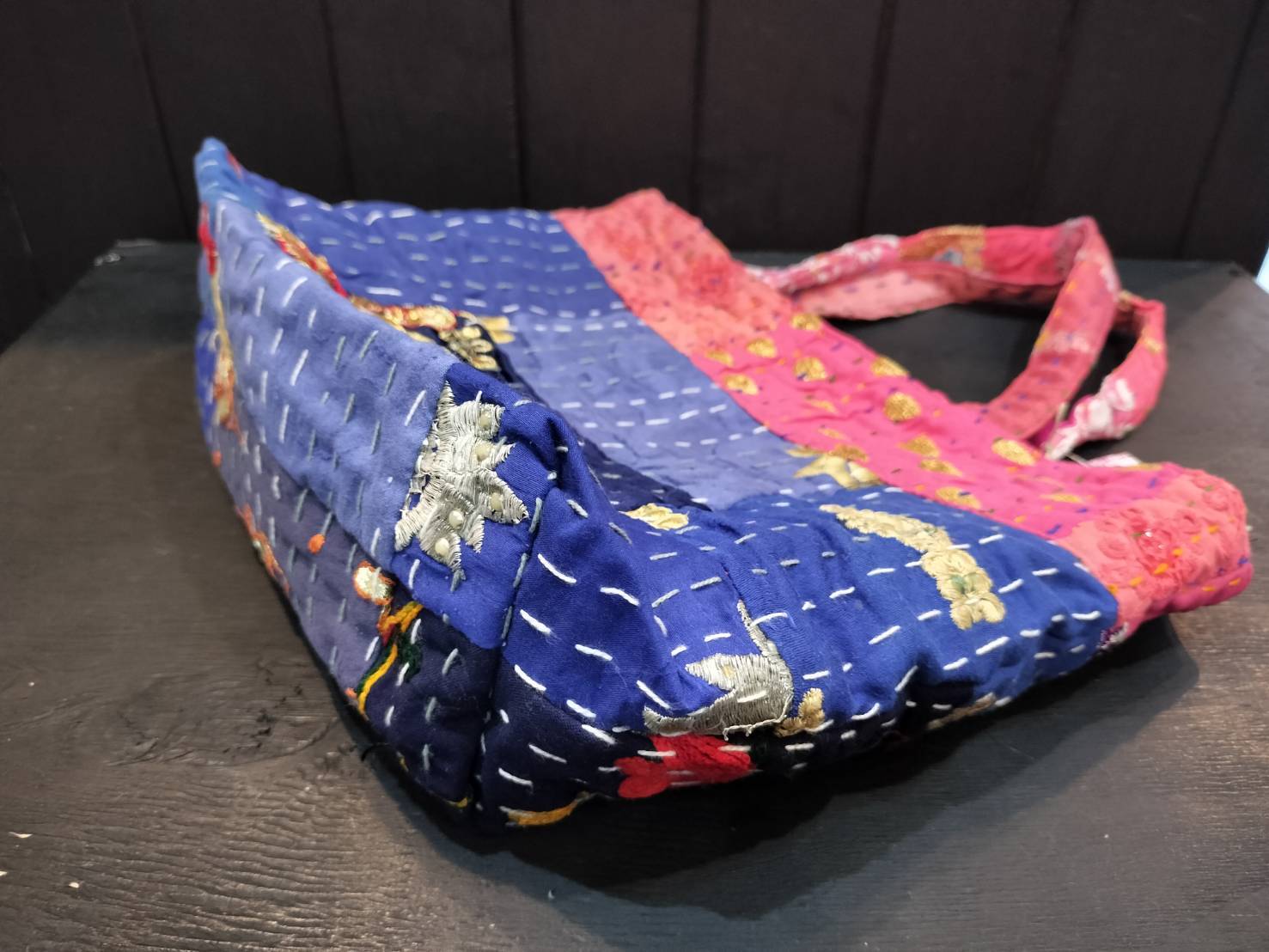 サリーなどの古布をパッチワークした生地にラリーステッチ(刺し子)を施したアイテムです。