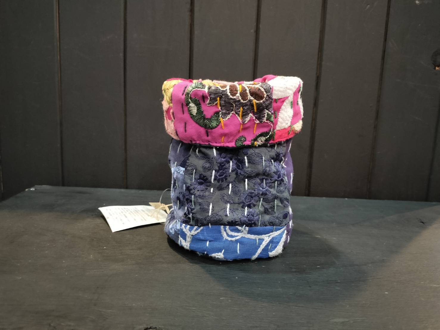 サリーなどの古布をパッチワークした生地にラリーステッチ(刺し子)を施したアイテムです。カラフルなパッチワークで毎日が楽しくなります。